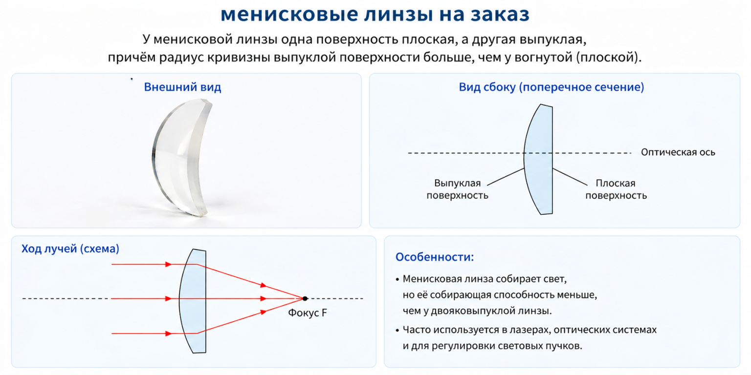 ООО Чанчунь Ютай Оптика (Changchun Yutai Optics Co., Ltd.) производит такие линзы с 2012 года. Основная продукция компании включает сферические оптические линзы, цилиндрические линзы, зеркала, фильтры, оптические плоские окна и призмы, которые широко применяются в таких областях, как формирование изображения, оборона, медицина, лазерные технологии, биометрическая идентификация, автоматизация и потребительская электроника. На сайте yt-optics.ru доступны интерактивные калькуляторы подбора материалов и примеры реализованных проектов — в том числе с менисками для лазерной хирургии и спектроскопических анализаторов.
